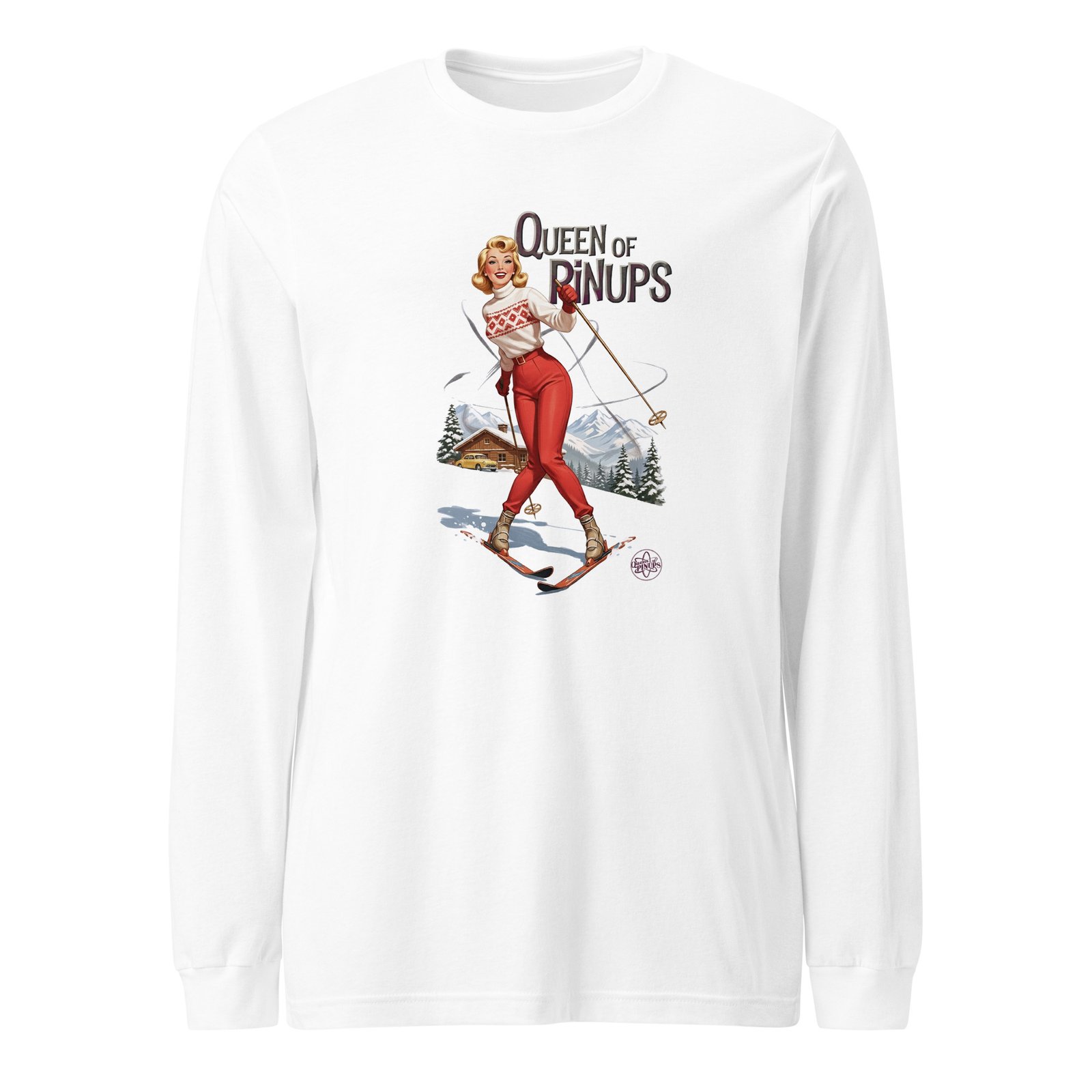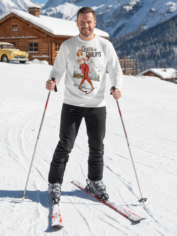 sweatshirt pin-up ski, mode rétro hiver, sweat Queen of Pinups, look années 50, style glamour alpin, icône féminine vintage, vêtements pin-up hiver, design rétro sports d’hiver, sweat chaud stylé, pin-up neige