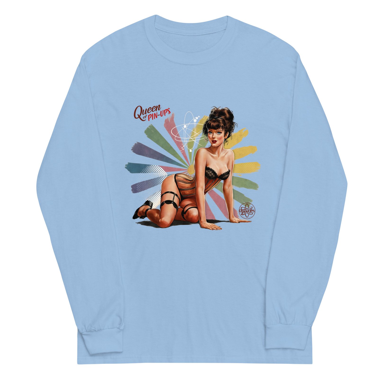 t-shirt manches longues pin-up, mode rétro femme, t-shirt Queen of Pinups, look années 50, style burlesque chic, icône féminine vintage, vêtements pin-up audacieux, design rétro glamour, t-shirt sexy old school