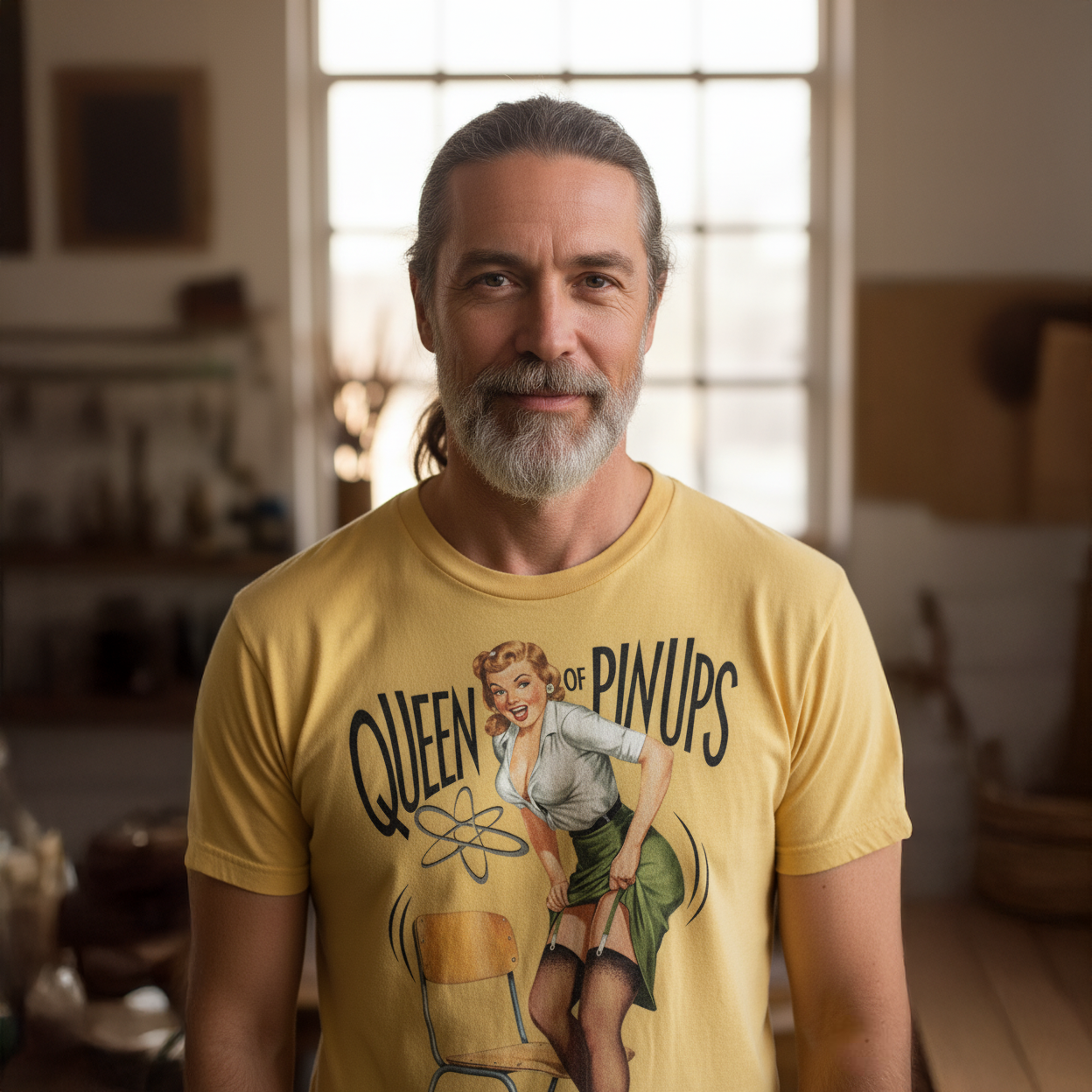 - t-shirt pin-up vintage, mode rockabilly femme, t-shirt glamour rétro, look années 50, icône féminine, t-shirt Queen of Pinups, style old school, vêtements pin-up, illustration rétro, art pin-up espiègle