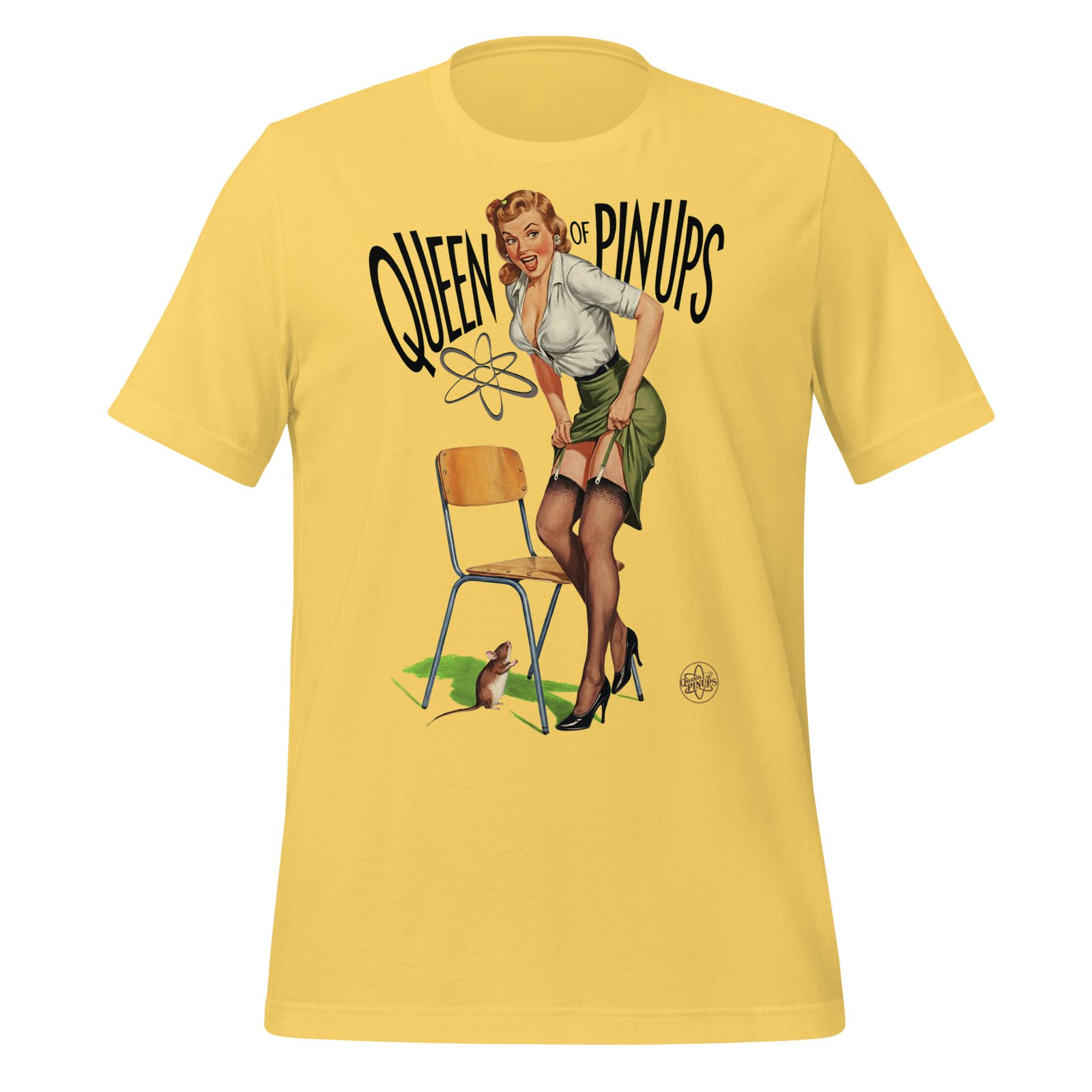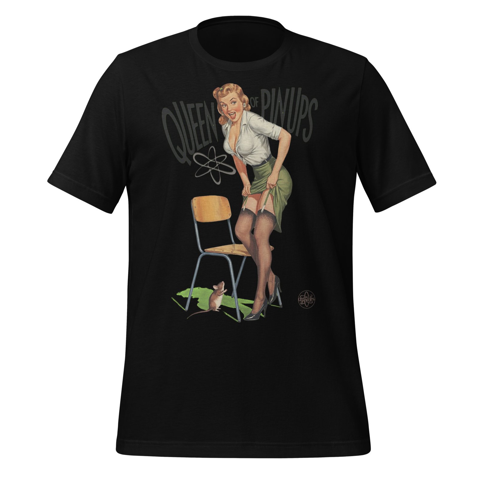 T-shirts Classiques Affirmez votre style avec ce T-shirt teacher Queen of Pinups, une pièce iconique inspirée de l’art vintage des années 50. Ce visuel audacieux met en scène une pin-up blonde au charme irrésistible, vêtue d’un chemisier blanc, d’une jupe verte et de bas noirs, dans une posture glamour et malicieuse. Elle ajuste ses bas avec élégance, sous le regard curieux d’une petite souris, dans une composition pleine de caractère et d’humour. Le fond noir met en valeur les couleurs vibrantes et le lettrage vert stylisé “QUEEN OF PINUPS”, accompagné d’un symbole atomique rétro et d’un emblème étoilé, renforçant l’esthétique rockabilly.